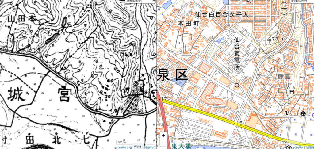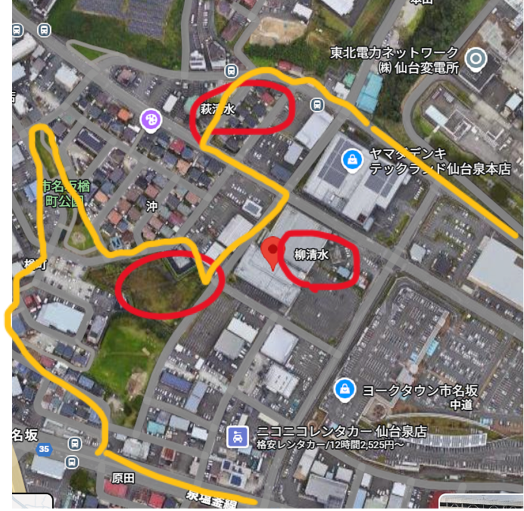 今回は仙台変電所の南、地名で残っている萩清水・柳清水を巡りました。江戸時代からの矢野家所有地(であろう)場所が仙台変電所となったのが1960年。その横の駐車場を下り、以前のコロナの湯あとのユニクロ脇を通り、柳清水があったヤマダ電機駐車場へ。七北田川の河岸段丘の下にはいくつもの清水が湧き出る箇所があり、松森・市名坂あたりでも今は使用しなくなった井戸がたくさんあります。萩清水は「まいどおおきに仙台市名坂食堂」の隣あたりにあったものと想定します。